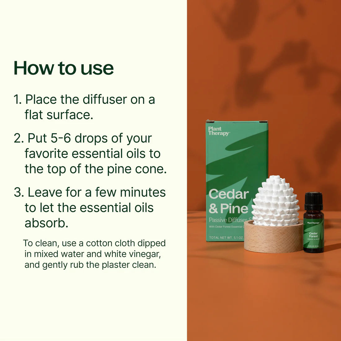 Bring the scents of fall into your home with our Cedar & Pine Passive Diffuser Set. The cute, intricate pine cone design adds a touch of autumn wherever it goes, while the exclusive Cedar Forest Essential Oil Blend infuses the scent of a peaceful, secluded fall forest. With just a few drops of this blend on the porous and unglazed pine cone, you’ll enjoy a gentle aroma in the air — without the use of heat or electricity. This decorative, reusable method to diffuse essential oils is excellent for small spaces, office desks, bedside tables, and more.