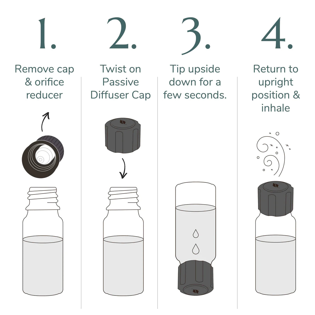 One way is to simply swap out the bottle’s original cap and orifice reducer, tip your bottle upside down for a moment, then breathe in deeply from the foam top. Another way is to remove the essential oil cap, leave in the orifice reducer, and add a drop or two of oil to the foam top of the Passive Diffuser Cap. Then, secure the Passive Diffuser Cap onto the bottle.