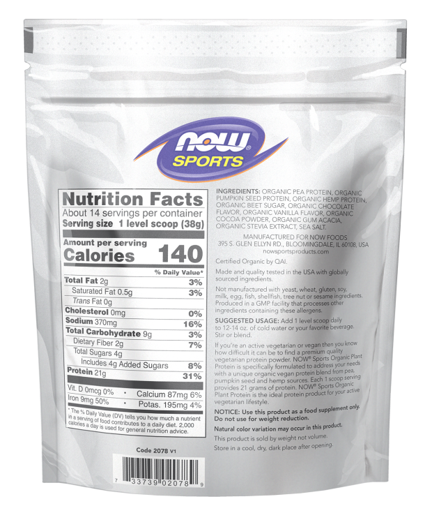 If you’re an active vegetarian or vegan then you know how difficult it can be to find a premium quality vegetarian protein powder. NOW® Sports Organic Plant Protein is specifically formulated to address your needs with a unique organic vegan protein blend from pea, pumpkin seed and hemp sources. Each 1 scoop serving provides 21 grams of protein. NOW® Sports Organic Plant Protein is the ideal protein product for your active vegetarian lifestyle.