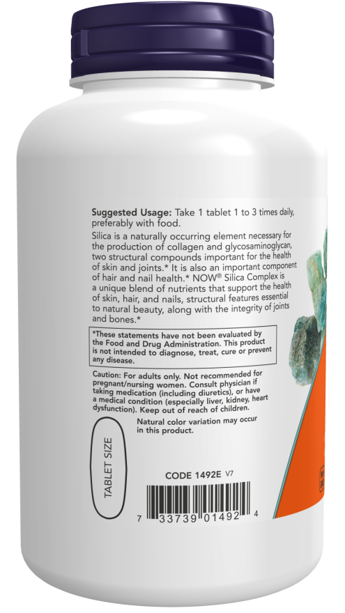 Silica is a naturally occurring element necessary for the production of collagen and glycosaminoglycan, two structural compounds important for the health of skin and joints.* It is also an important component of hair and nail health.* NOW® Silica Complex is a unique blend of nutrients that support the health of skin, hair, and nails, structural features essential to natural beauty, along with the integrity of joints and bones.*